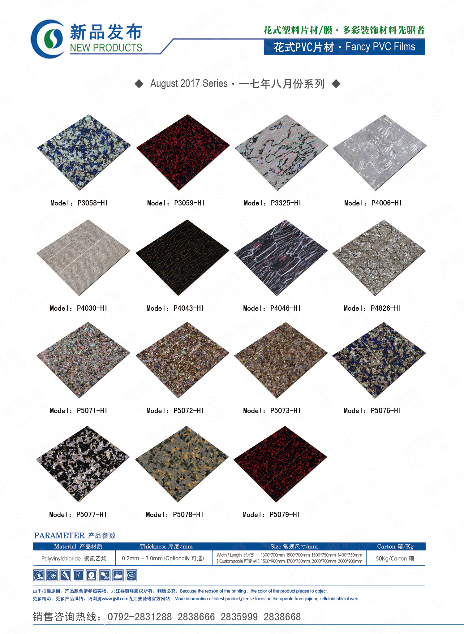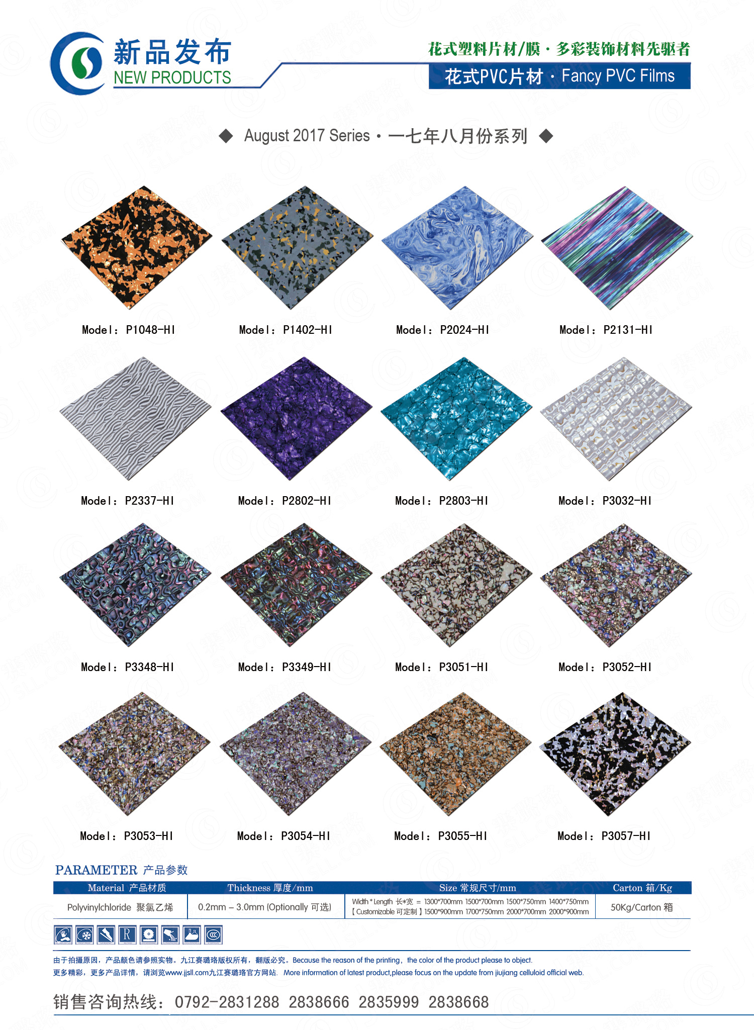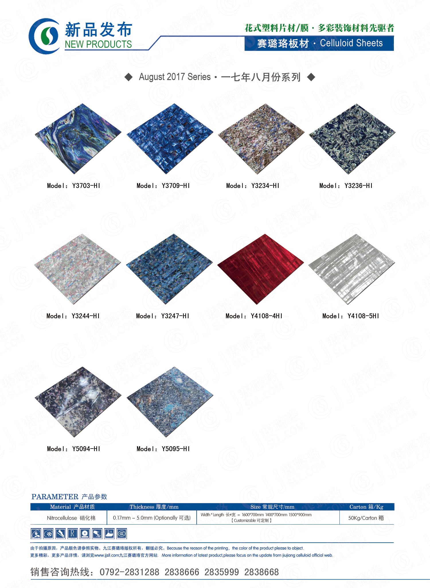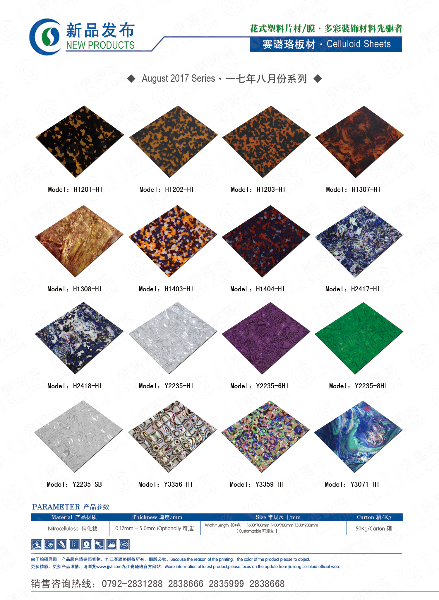 九江賽璐珞實業(yè)有限公司2017年八月份賽璐珞板材、瑪瑙膜、理石膜、樂器裝飾材料、花式PVC片材新品發(fā)布,花式塑料片材/膜·多彩裝飾材料先驅者。咨詢熱線:0792-2838668 / 2831288 / 2838666 / 2835999。點擊圖片查看詳細產品
